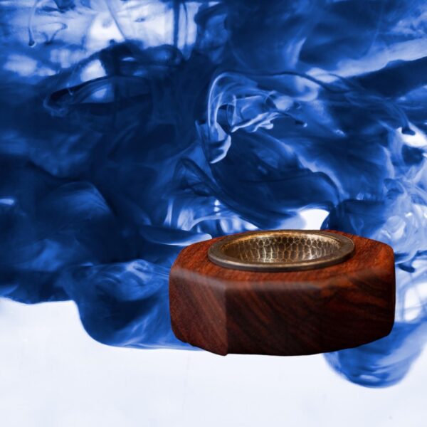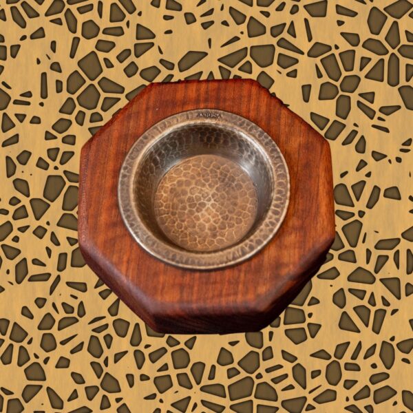 La base lignea è ottima per isolare dal calore la coppa che contiene le braci ardenti, e la forma ottagonale ne conferisce un’estetica distintiva, rendendo questo oggetto non solo funzionale ma anche decorativo. Ogni pezzo è lavorato a mano, con leggere variazioni che ne attestano unicità e artigianalità..
