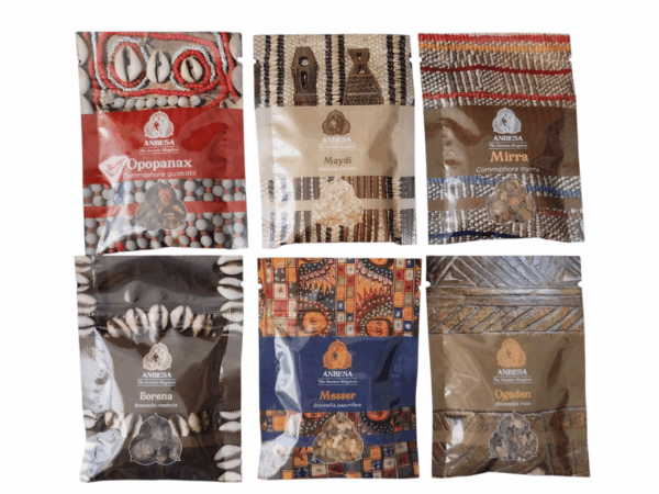 Il kit include sei tipologie selezionate per la loro varietà aromatica: Mirra, Messer, Opopanax, Borena, Maydi e Ogaden. Ogni resina presenta caratteristiche uniche, con profili che spaziano da note balsamiche e resinose a sfumature più dolci, speziate o agrumate.